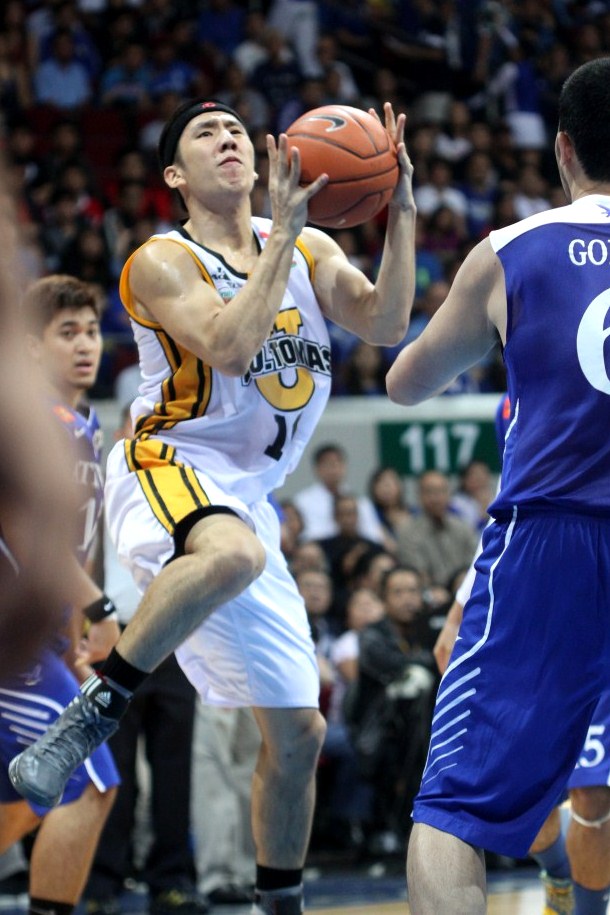 The 2 -frame sequence below shows Ryan Buenafe using great body control while driving from the right {against Aljon Mariano [#10]}. The ball acrually trickled for a micro-micro second before eventually trickling in. And 1 !!